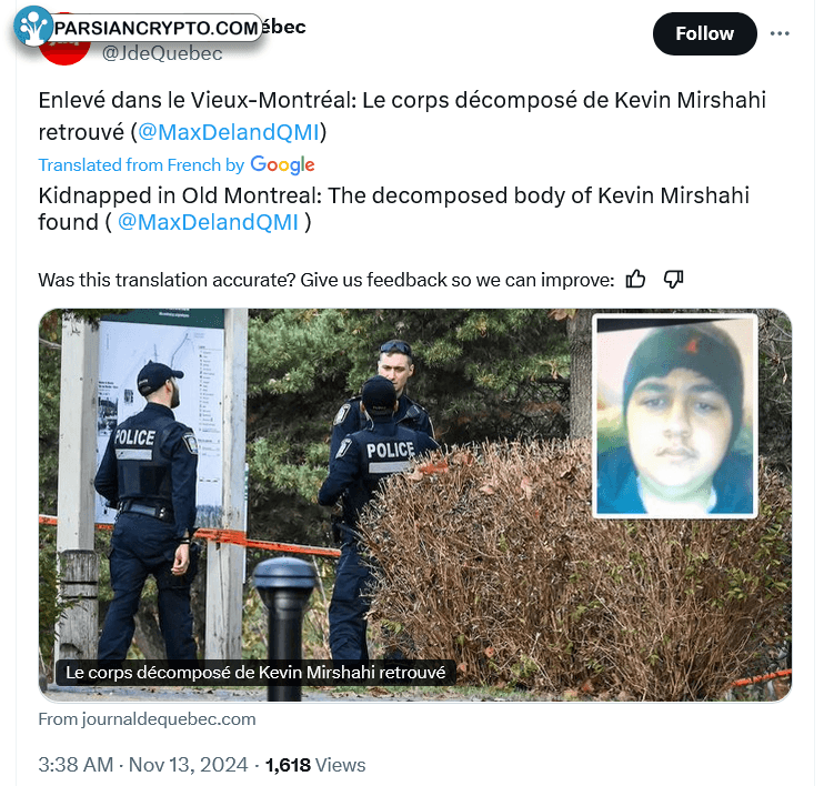 به گزارش Le Journal de Québec، پیکر یک مرد ۳۲ ساله که در دنیای رمز ارز شناختهشده بود، در پارکی در مونترال کانادا پیدا شد. این فرد از ماه ژوئن از خانه خود ربوده شده بود و پلیس در حال بررسی این پرونده است.