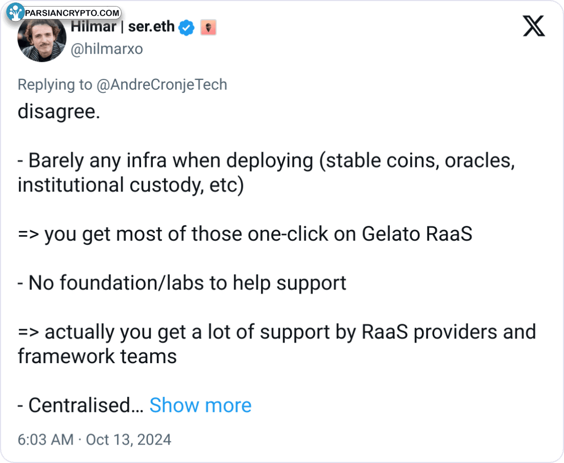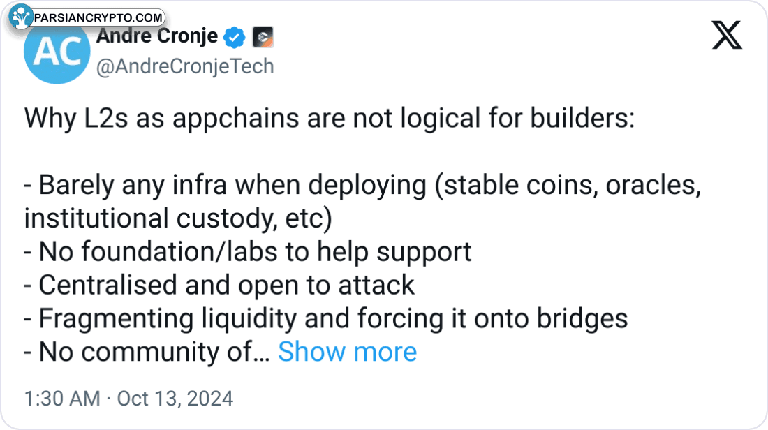به گزارش Cointelegraph، آندره کرونیه، یکی از مدیران Sonic Labs، اخیراً دیدگاههای خود را درباره اپچینها بهویژه برای توسعهدهندگان مطرح کرده است. او در تاریخ ۱۳ اکتبر به برخی مشکلات اشاره کرده است.