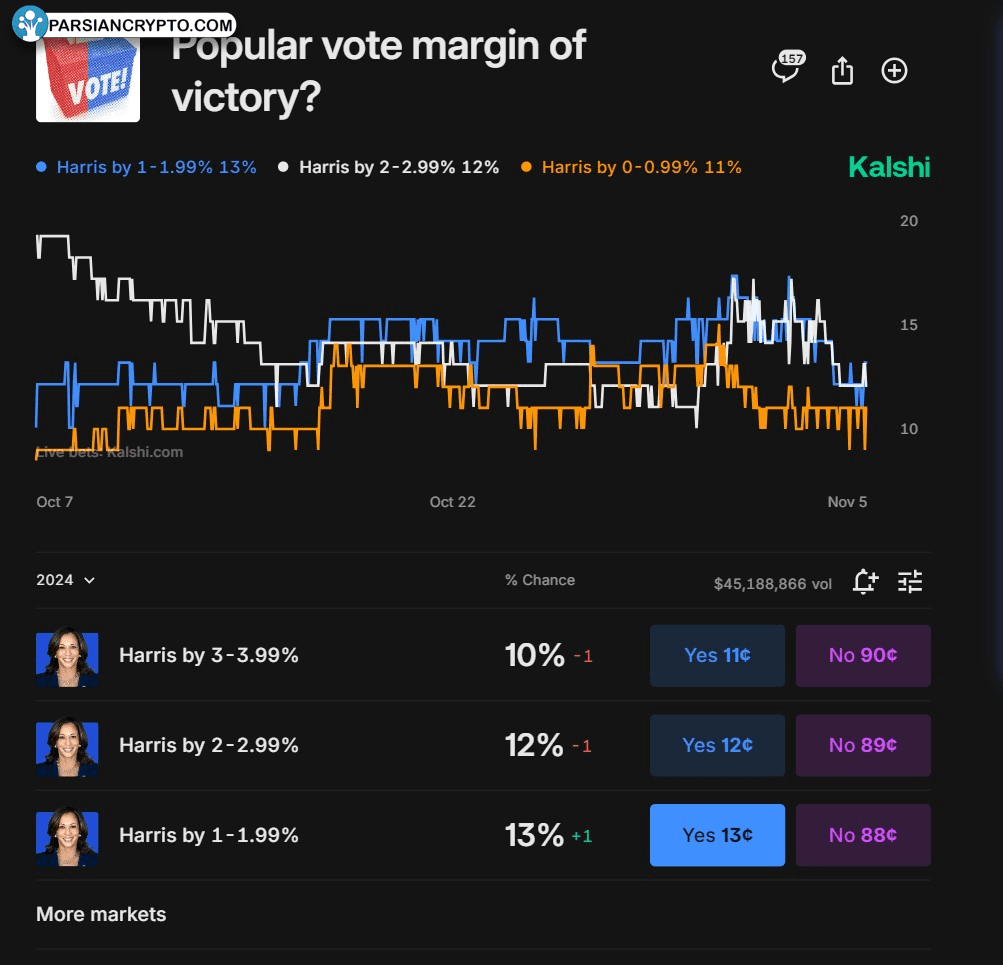 به گزارش Cointelegraph، در حال حاضر مبلغی نزدیک به ۴ میلیارد دلار بر روی نتایج انتخابات ریاست جمهوری آمریکا شرطبندی شده است. یکی از مهمترین سایتهای شرطبندی در این زمینه، Polymarket است که با وجود محدودیتهای قانونی در آمریکا، تقریباً ۳.۳ میلیارد دلار شرطبندی را جذب کرده است. در عین حال، سایر پلتفرمهای شرطبندی مانند Kalshi، Robinhood و Interactive Brokers نیز مجموعاً حدود ۵۰۰ میلیون دلار شرطبندی کردهاند.