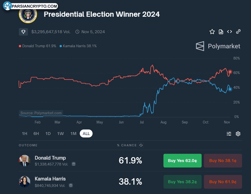 در حال حاضر دونالد ترامپ با شانس ۶۲ درصد در Polymarket به عنوان پیشتاز مطرح است. این در حالی است که سایر پلتفرمها این شانس را نزدیک به ۵۸ درصد ارزیابی کردهاند. کاربران در این سایتها میتوانند قراردادهایی خریداری کنند که بر اساس نتایج مختلف انتخابات، مانند تعداد کل آرا یا میزان پیروزی یک نامزد، سوددهی کنند.