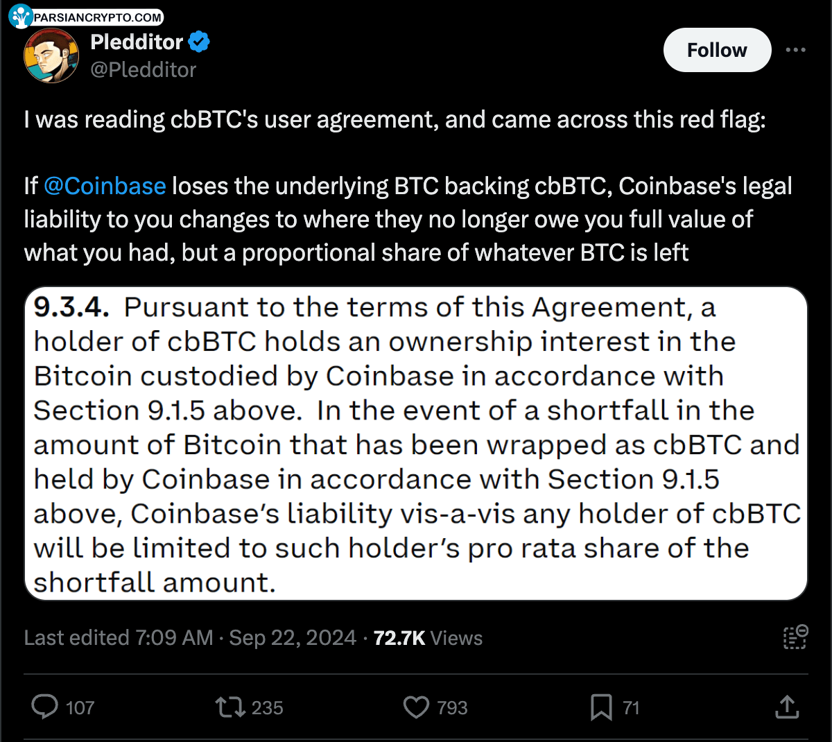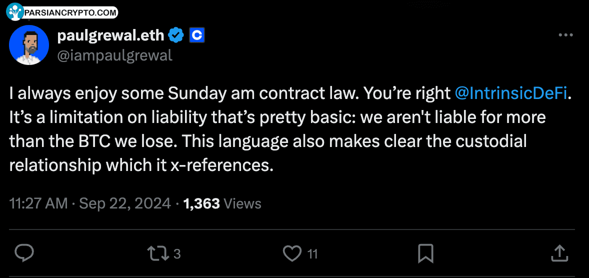 برخی افراد نگران قوانین استفاده از cbBTC بودند. پاول گروال، مسئول حقوقی کوینبیس، درباره این نگرانیها صحبت کرد. او اطمینان داد که اگر کوینبیس هر بیتکوینی را از دست بدهد، کل میزان بیتکوین را به مشتریان بازخواهد گرداند. این اقدام مهم است زیرا به کاربران احساس امنیت میدهد.