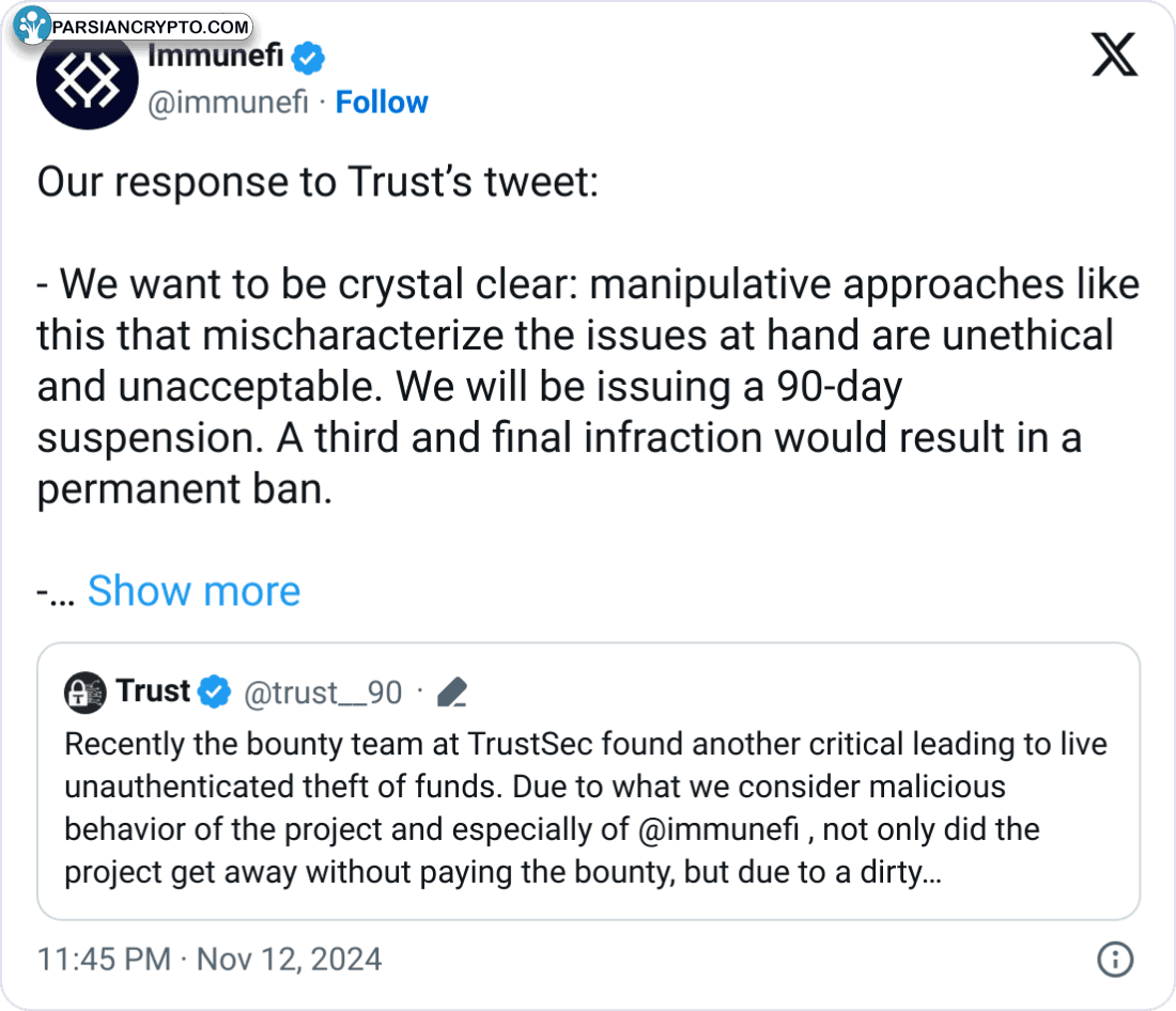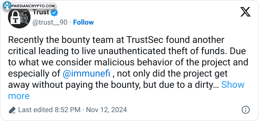 به تازگی، ایمیونفی که به عنوان پلی برای کمک به یافتن و رفع مشکلات امنیتی در پروژههای آنلاین شناخته میشود، همکاری خود را با کمپانی Trust Security متوقف کرده است. دلیل این اقدام، اختلاف نظر بین دو شرکت در مورد پرداخت پاداش برای کشف یک مشکل امنیتی جدی بود.