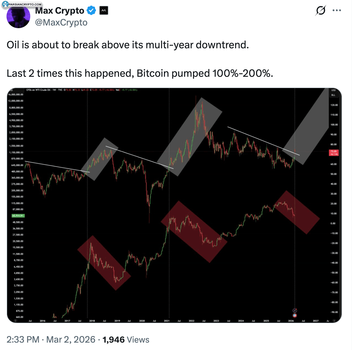 از نظر فنی نیز، زمانی که نفت از روند نزولی چندساله عبور کند، معمولاً به دنبال آن، رالیهای قدرتمندی در بیت کوین رخ داده است؛ به گونهای که در برخی موارد شاهد رشد ۱۰۰ تا ۲۰۰ درصدی بیت کوین در ماههای بعد بودهایم. این مسأله نشان میدهد که ارتباط میان انرژی و بازار رمزارزها اگرچه در کوتاهمدت منفی است، اما در افق بلندمدت بیت کوین انعطاف و قدرت زیادی از خود نشان میدهد.