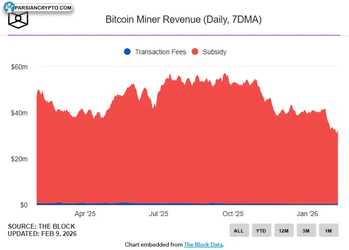 در تحلیل فاندامنتال بیت کوین و بازار هشریت بیت کوین، باید به رویدادها و اخبار بازار توجه ویژهای داشت. کاهش شدید سهم کارمزد تراکنشها در درآمد ماینرها، که از ۷ درصد به حدود ۱ درصد رسیده، اثر مستقیمی بر انگیزه استخراج دارد. این افت درآمد کارمزد ناشی از کاهش رونق فعالیتهای آنچین و در نتیجه کاهش حجم تراکنشها در شبکه بوده است.