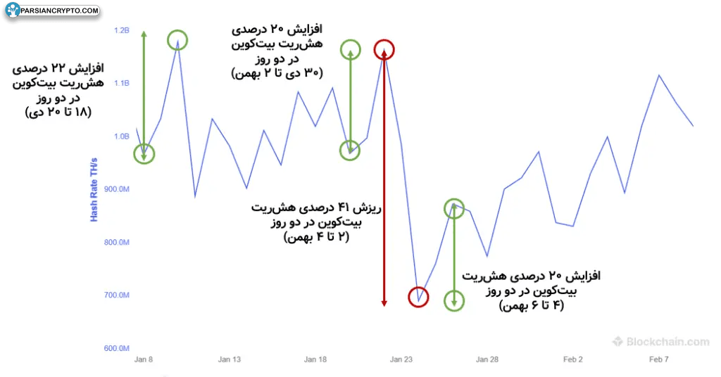 نمودار نشاندهنده نوسانات هشریت بیت کوین طی دوره زمانی مشخصی است. ابتدا، افزایش ۲۲ درصدی هشریت بیت کوین از ۱۸ تا ۲۰ دی ماه مشاهده میشود. سپس، افزایش ۲۰ درصدی دیگر از ۳۰ دی تا ۲ بهمن رخ میدهد. با این حال، یک کاهش قابل توجه ۴۱ درصدی از ۲ تا ۴ بهمن دیده میشود. پس از این افت، مجدداً افزایش ۲۰ درصدی از ۴ تا ۶ بهمن ماه رخ میدهد. این تغییرات نشاندهنده نوسانات شدید در قدرت پردازش شبکه بیت کوین هستند که میتواند به دلیل عوامل متعددی از جمله تغییرات در تعداد ماینرها یا نوسانات بازار باشد.