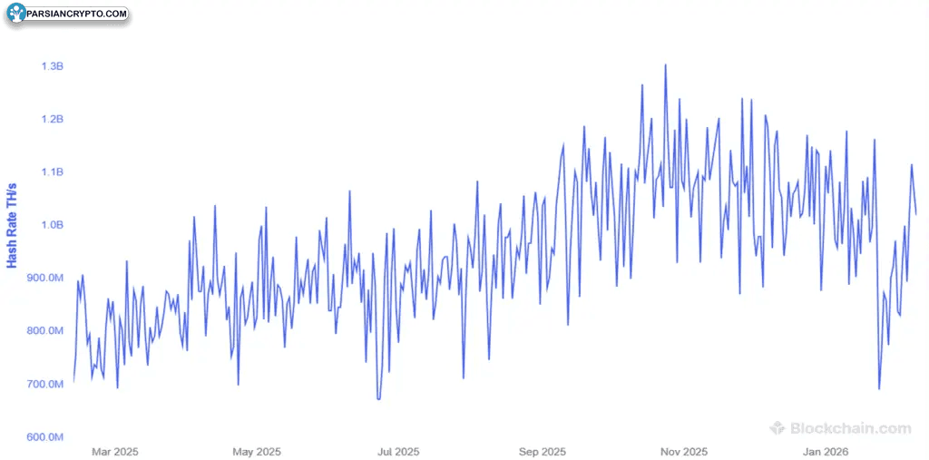 نرخ هش شبکه به طور کلی روند صعودی را از مارس ۲۰۲۵ تا ژانویه ۲۰۲۶ نشان میدهد، که بیانگر افزایش قدرت محاسباتی و امنیت شبکه در این بازه زمانی است. نوسانات موجود در نمودار به تغییرات موقتی در فعالیت ماینرها و قدرت پردازش اشاره دارد. این رشد پایدار در نرخ هش میتواند نشانهای از افزایش علاقه و سرمایهگذاری در بخش ارزهای دیجیتال باشد و همچنین میتواند بر افزایش پذیرش و کارایی شبکه تأثیر مثبت بگذارد. بررسی این روندها برای تحلیلگران مالی و علاقهمندان به ارزهای دیجیتال اهمیت ویژهای دارد.