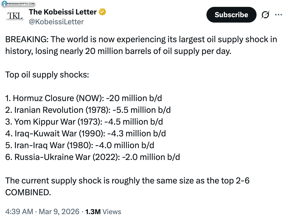 جهان در حال تجربه بزرگترین شوک عرضه نفت در تاریخ است و تقریباً روزانه ۲۰ میلیون بشکه نفت از دست میدهد. این شوک عرضه، از لحاظ بزرگی، با مجموع شوکهای قبلی مانند انقلاب ایران، جنگ یوم کیپور، جنگ عراق و کویت و جنگ ایران و عراق برابری میکند. چنین وضعیتی تأثیر بسزایی بر تحلیلهای مالی و بازارهای کریپتو دارد و اهمیت بررسی دقیق دادهها را دوچندان میکند.