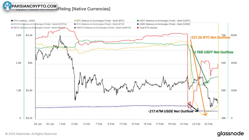 ذخایر صرافی بایبیت در ماه فوریه شاهد تغییرات قابل توجهی بوده است. روند خروج خالص ۴.۳ میلیارد دلاری برای بیت کوین و استیبلکوینها نشاندهنده کاهش اعتماد سرمایهگذاران به این داراییها است. در عین حال، خروج خالص ۱۱۷ میلیون دلاری اتریوم و بازیابی ذخایر به میزان ۱.۱۹ میلیارد دلار، بیانگر نوسانات شدید در بازار اتریوم است. این تغییرات میتواند ناشی از حملات سایبری یا تغییرات در استراتژیهای سرمایهگذاری کاربران باشد که تأثیر مستقیم بر تراز مالی این صرافی دارد.